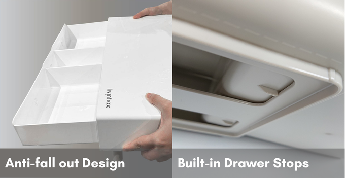 Seperti semua produk livinbox dengan laci, unit-unit ini dilengkapi dengan penghenti laci bawaan—desain inovatif yang mencegah laci jatuh dari bingkai saat sepenuhnya terbuka. Ini menghindari tumpahan yang berantakan dan memungkinkan pengguna untuk melihat langsung ke bagian belakang laci tanpa khawatir.
