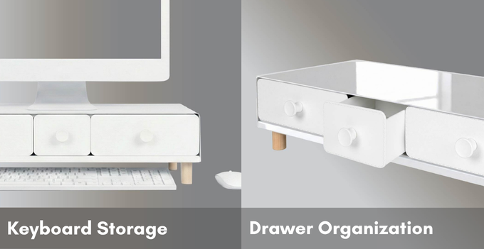 Termasuk dua laci besar dan satu laci kecil untuk organisasi alat tulis, alat kantor, dan barang pribadi yang efisien. Ruang terbuka di bawah stand juga menyediakan penyimpanan keyboard yang nyaman, membantu menjaga desktop tetap teratur dan bebas dari kekacauan.
