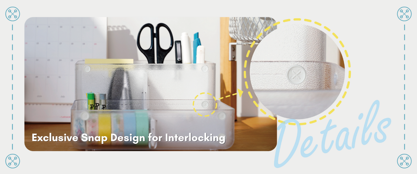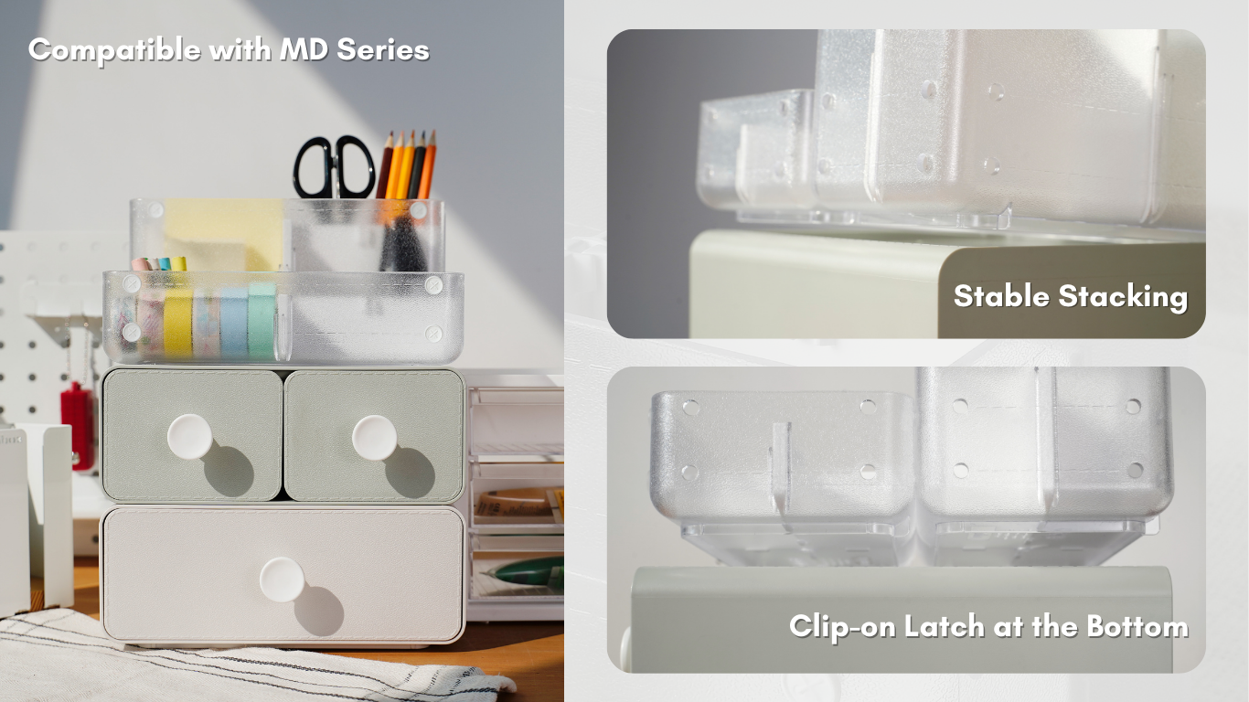 Setiap set wadah dilengkapi dengan pengait bawaan di bagian bawah. Ini mengait dengan aman ke bagian atas unit lain, menjadikannya dapat ditumpuk. Pasangkan dengan seri MD untuk solusi penyimpanan yang lengkap: gunakan wadah terbuka di atas untuk akses cepat ke barang-barang sehari-hari, dan unit laci di bawah untuk menjaga bagian kecil tetap rapi dan aman.