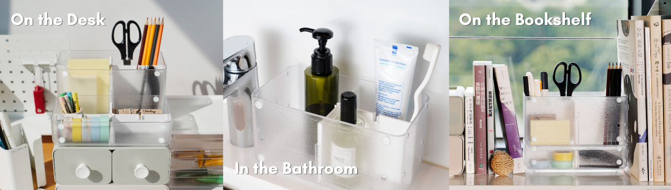 Tempat sampah ini cocok digunakan di mana saja dalam hidup Anda: sambungkan mereka di meja Anda untuk tetap teratur, tumpuk mereka untuk menghemat ruang di rak Anda, atau gunakan di kamar mandi untuk menjaga perlengkapan mandi Anda tetap rapi dan kering.