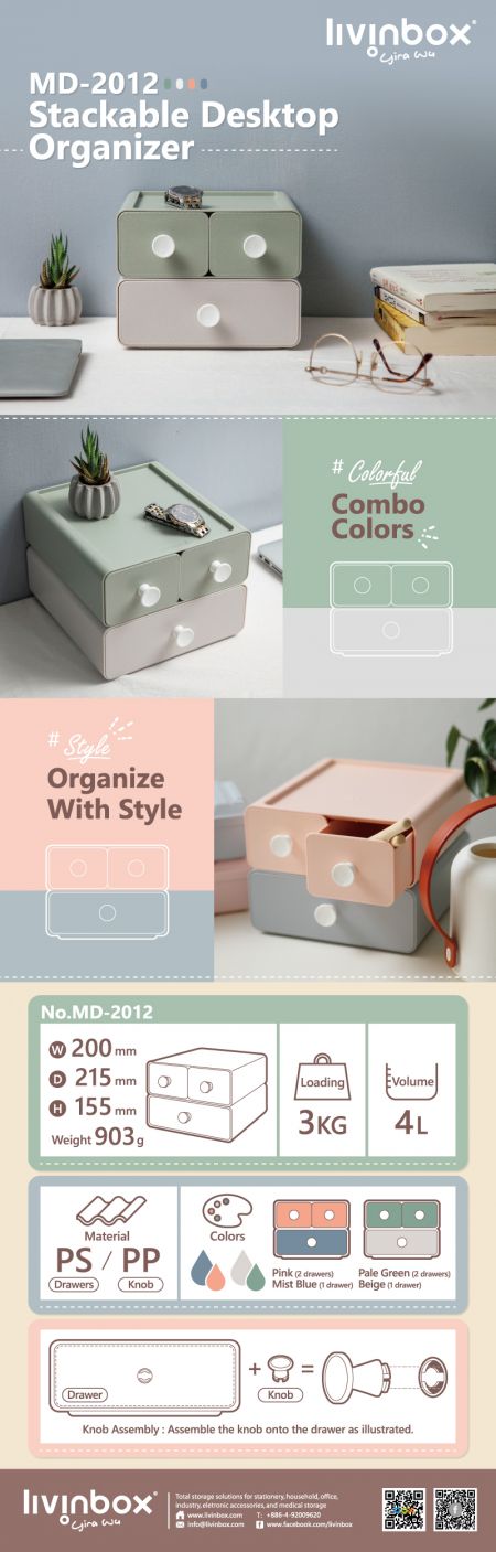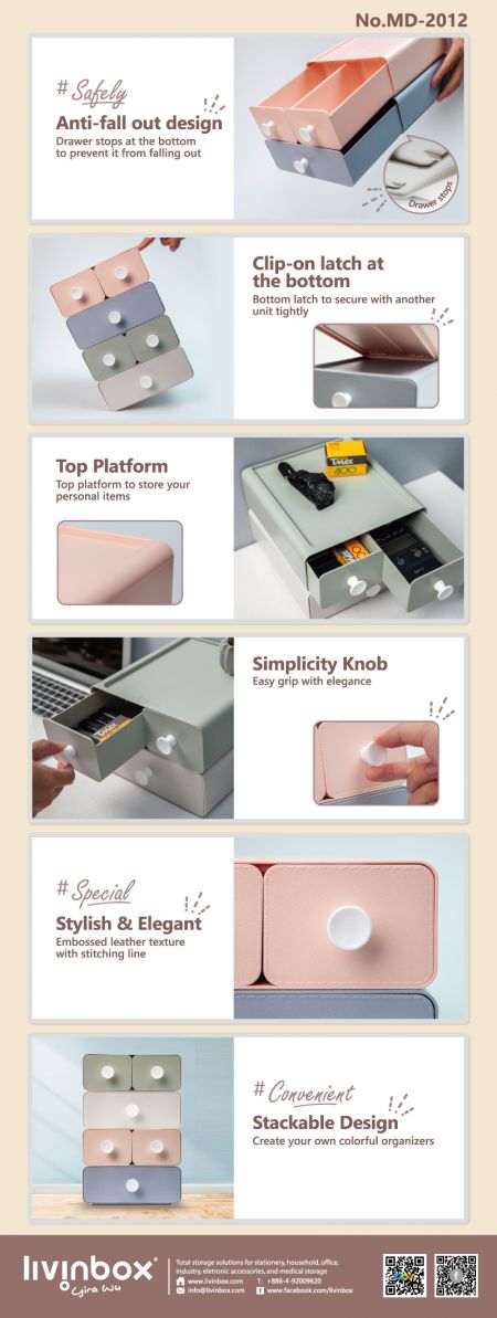 Questo organizzatore versatile e elegante è progettato per migliorare l'efficienza dello spazio di lavoro, aggiungendo un tocco di sofisticatezza a qualsiasi ambiente. ★ Caratteristiche principali: 〔Modulare e impilabile in sicurezza〕 Dotato di un gancio integrato, gli utenti possono impilare in modo sicuro più unità per creare una soluzione di stoccaggio più ampia, massimizzando l'utilizzo dello spazio. 〔Combinazione di colori〕 Disponibile in quattro colori di tendenza, gli utenti hanno la flessibilità di personalizzare e coordinare l'organizzatore con la decorazione interna, aggiungendo un tocco personale al loro spazio di lavoro. Altri colori sono disponibili su richiesta (quantità minima d'ordine richiesta). 〔Cassetti grandi e piccoli in un'unica unità〕 Ogni unità combina cassetti grandi e piccoli, offrendo una versatilità senza pari per organizzare vari articoli, dalle forniture per ufficio agli accessori. 〔Fermi integrati per i cassetti〕 Progettato con fermi integrati per i cassetti, questo organizer garantisce un'organizzazione ordinata impedendo ai cassetti di cadere quando sono completamente aperti. 〔Spazio per ulteriore archiviazione in cima〕 Il piano piatto con un bordo rialzato funge da scaffale aggiuntivo, offrendo spazio di archiviazione extra per gli oggetti utilizzati frequentemente, promuovendo un ambiente di lavoro privo di disordine. 〔Maniglie ergonomiche per i cassetti〕 Le maniglie ergonomicamente progettate consentono di aprire e chiudere i cassetti senza sforzo, soddisfacendo gli utenti con problemi alle mani per un'esperienza senza soluzione di continuità. 〔Superficie in pelle in rilievo〕 Aggiungendo un tocco di sofisticazione, la texture in pelle in rilievo e il bordo cucito sul fronte dei cassetti migliorano l'appeal estetico dell'organizer. ★ Specifiche • Numero prodotto: MD-2012 • Dimensioni: 200L×210P×155A mm • Cassetto grande: 191Lx203PxA 85 mm • Cassetto piccolo: 98,5Lx203PxA 85 mm • Materiale: PS • Capacità: 4L • Carico: 3Kg ★ Per ulteriori informazioni, contattare il nostro team commerciale all'indirizzo info@livinbox.com.'SHUTER' è un produttore di contenitori per la conservazione: organizzatori per scrivania, armadietti di plastica, custodie portatili per progetti, contenitori per l'ufficio, casse pieghevoli, contenitori impilabili, dal Taiwan dal 1969. Affidati ai prodotti di stoccaggio in plastica certificati ISO di SHUTER. Con tecnologia avanzata e rigoroso controllo di qualità, garantiamo durata e funzionalità in ogni pezzo. Crea la tua configurazione di archiviazione ideale con le opzioni personalizzabili di SHUTER. Scegli tra una varietà di dimensioni, stili e colori per soddisfare le tue esigenze specifiche e l'estetica.