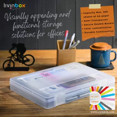 livinbox의 세련되고 안전한 프로젝트 케이스를 소개합니다. 문서 운송과 조직을 위해 섬세하게 제작되었습니다. ★최대 350매의 A4 용지 수용량과 튼튼한 구조로 필수 문서의 안전한 운송을 보장합니다. ★반투명 디자인과 맞춤형 외관 색상으로 파일 조직이 쉬워집니다. 기업 환경에 적합하며 대량 구매에 이상적입니다. ★프리미엄 PP 소재로 제작되어 내구성과 환경 안전을 보장합니다. 사무실, 학교 또는 가정 조직 요구에 이상적인 솔루션입니다.SHUTER는 1969년부터 대만에서 운영되는 수납용품 제조업체로서, 책상 정리함, 플라스틱 수납 캐비닛, 휴대용 프로젝트 케이스, 사무실 수납함, 접이식 상자, 쌓을 수 있는 수납함 등을 생산합니다. SHUTER의 ISO 인증 플라스틱 보관 제품에 신뢰하세요. 고급 기술과 엄격한 품질 관리로 모든 제품에서 내구성과 기능성을 보장합니다. SHUTER의 맞춤형 옵션으로 이상적인 저장 공간을 만들어보세요. 특정 요구사항과 미학에 맞게 다양한 크기, 스타일 및 색상 중에서 선택하세요.